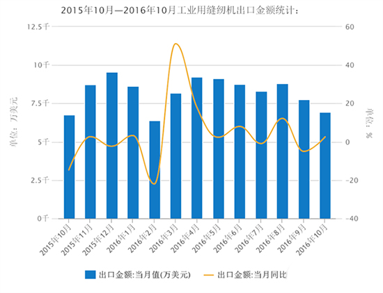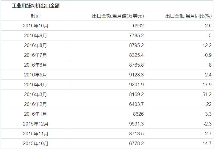 以下為2015年10月—2016年10月工業用縫紉機出口金額統計: