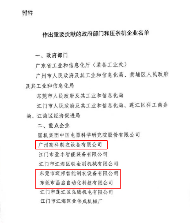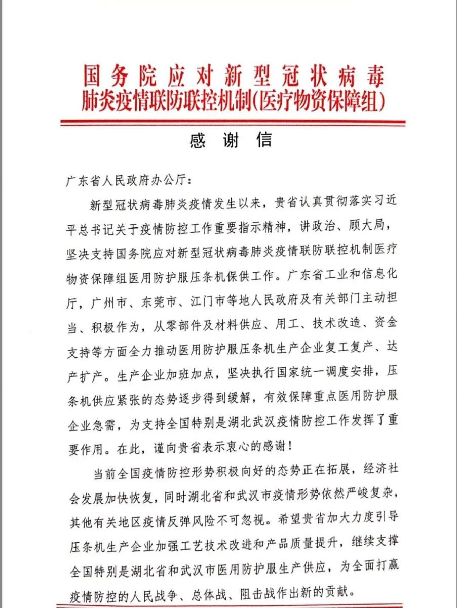 3月1日,國務院應對新型冠狀病毒肺炎疫情聯防聯控機制(醫療物資保障組)發出感謝信,對廣東省工信廳,廣州市、東莞市、江門市工信局以及廣州高科制衣設備有限公司、東莞市邁邦智能制衣設備有限公司、東莞市昌啟自動化科技有限公司等作出重要貢獻的政府部門和防疫物資生產企業給予了高度“點贊”。同時,勉勵政府部門和企業為全面打贏疫情防控的人民戰爭、總體戰、阻擊戰作出新的貢獻。