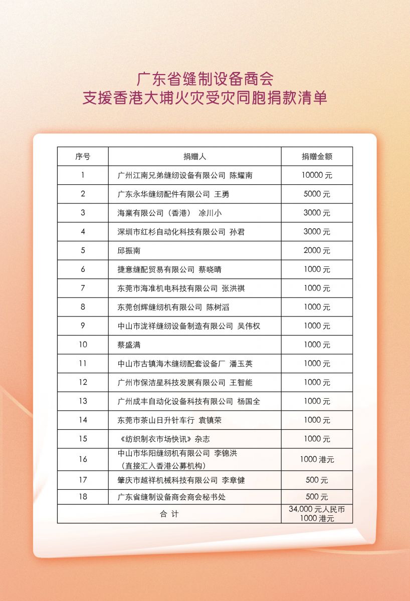 請將善款轉賬至商會指定賬戶(廣東省縫制設備商會工作微信號:18926211488,聯系人:梁啟明),由商會匯總后統一捐至公募機構,定向用于香港大埔區火災救援項目。